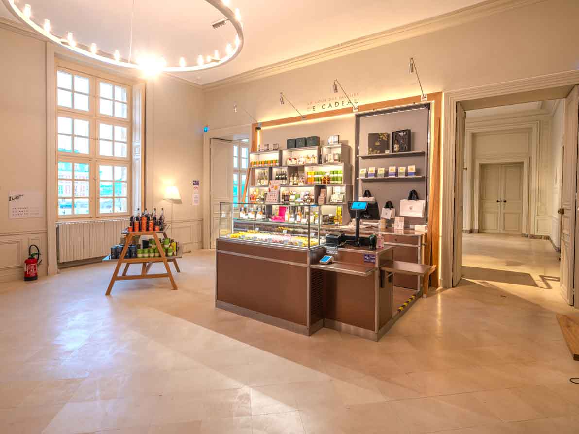 The shop is accessible in the basement after the entrance A or at the exit of the visit.